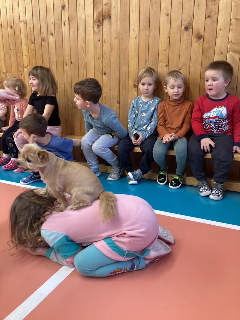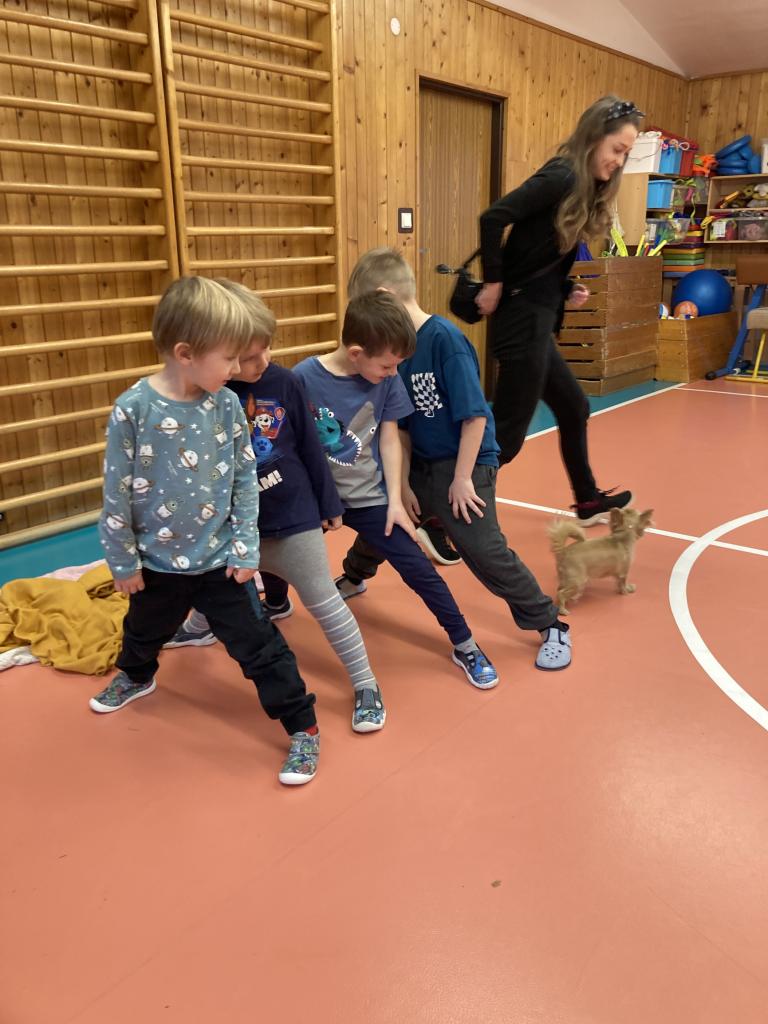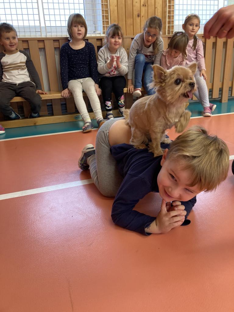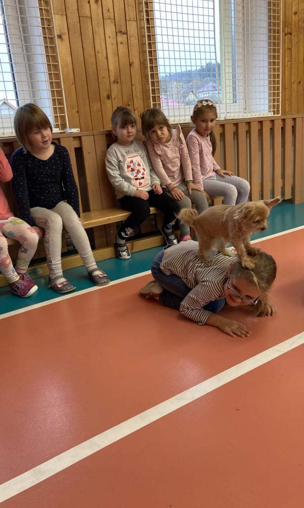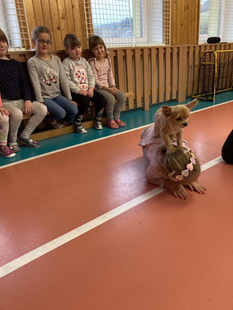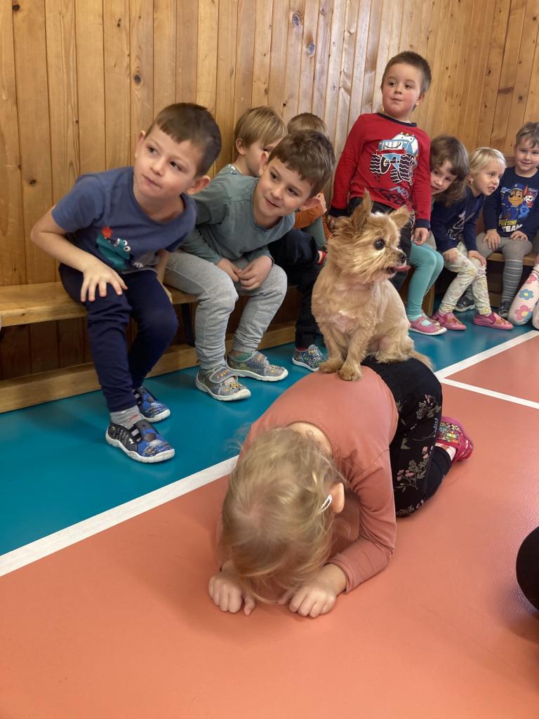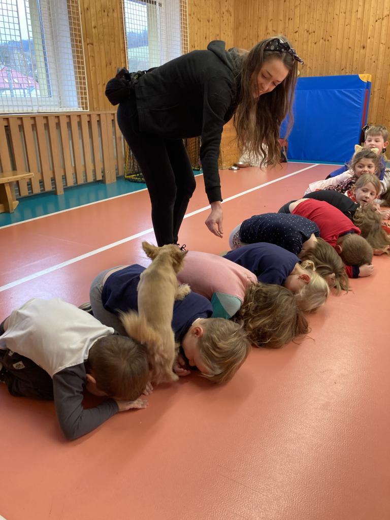V úterý 19. 11. byla u nás milá návštěva, přijeli za námi dva pejsci Katy a Elliot. Připravili si pro nás několik zajímavých triků, při nichž jsme mohli asistovat i my. Vytvořili jsme překážkovou dráhu a s napětím sledovali, zda Katy vše zvládne. Největší radostí byla chůze pejska po našich zádech.