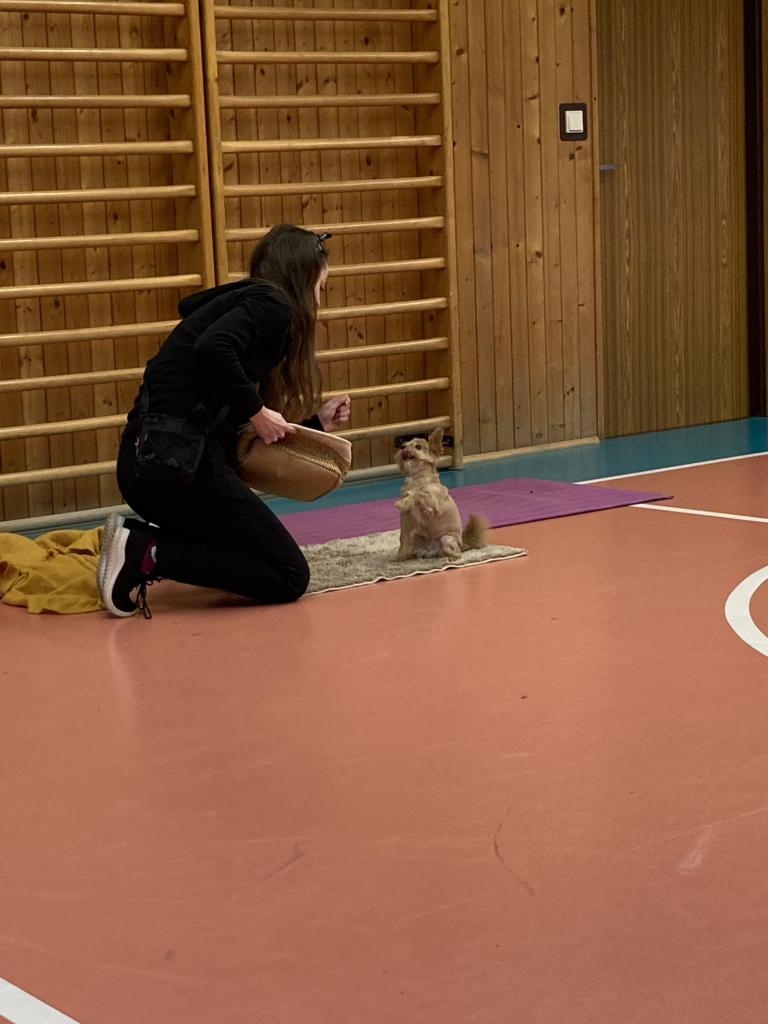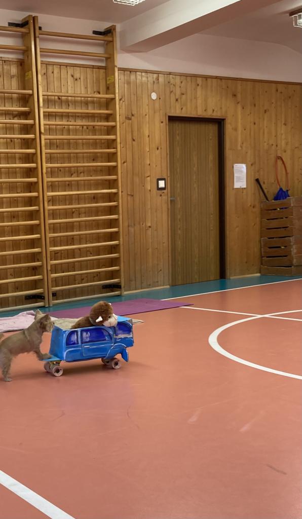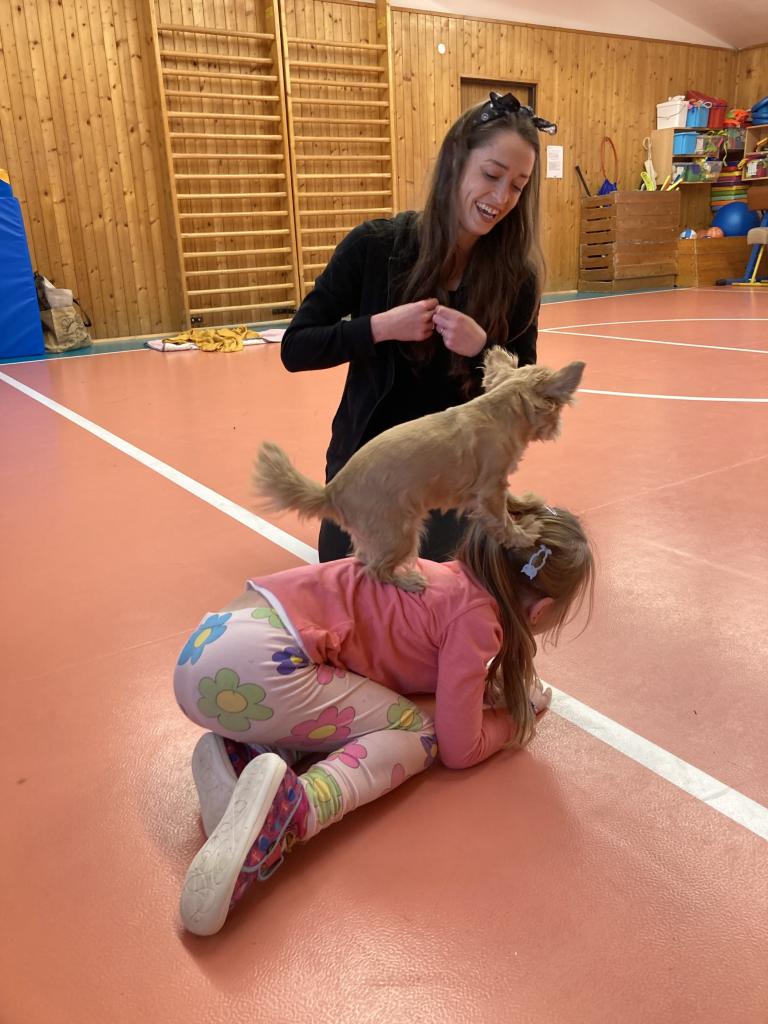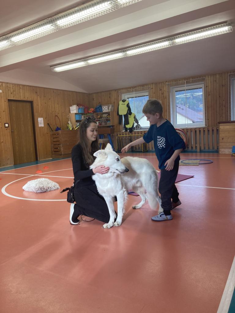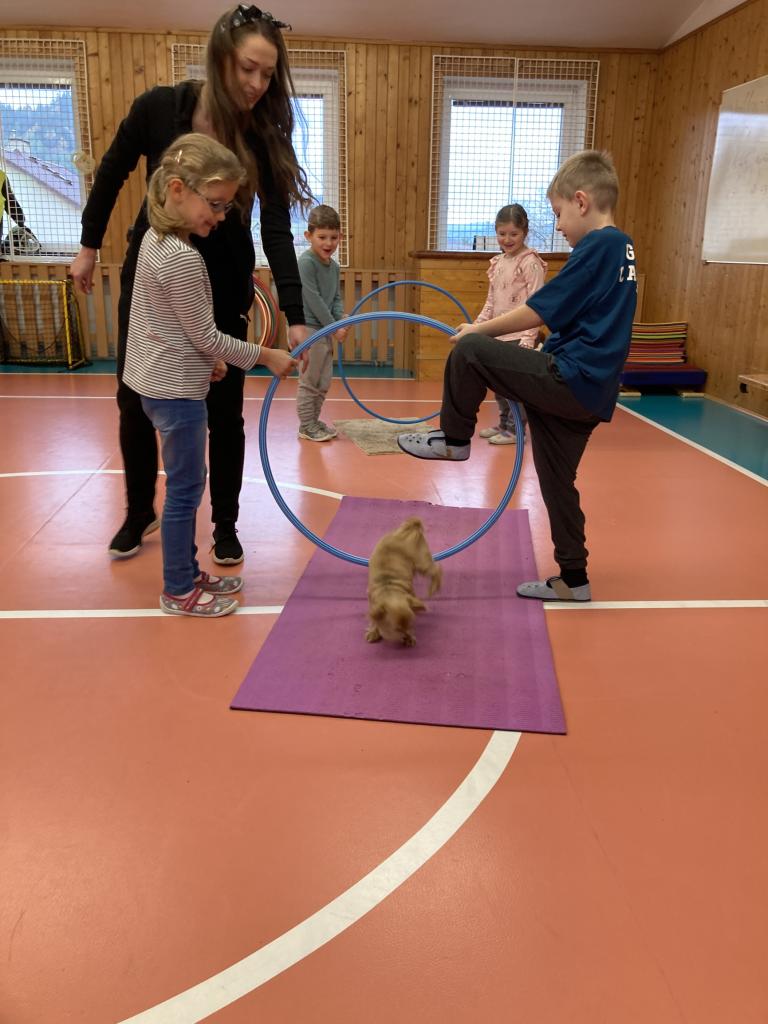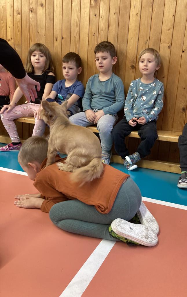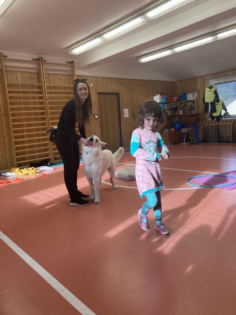 V úterý 19. 11. byla u nás milá návštěva, přijeli za námi dva pejsci Katy a Elliot. Připravili si pro nás několik zajímavých triků, při nichž jsme mohli asistovat i my. Vytvořili jsme překážkovou dráhu a s napětím sledovali, zda Katy vše zvládne. Největší radostí byla chůze pejska po našich zádech.
