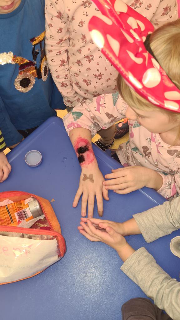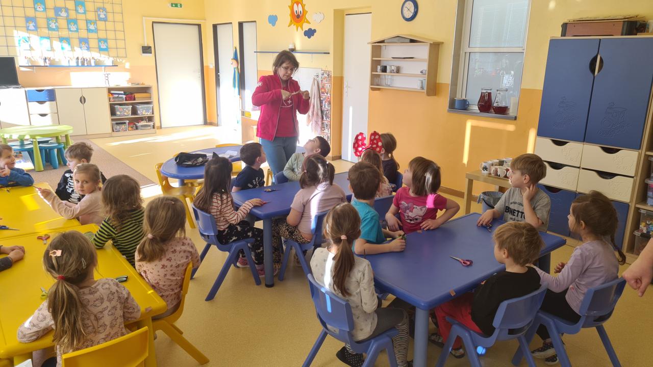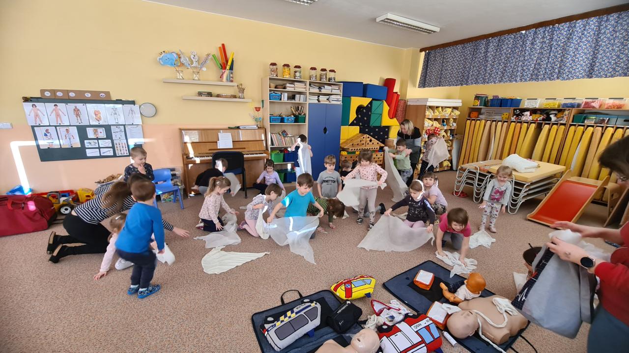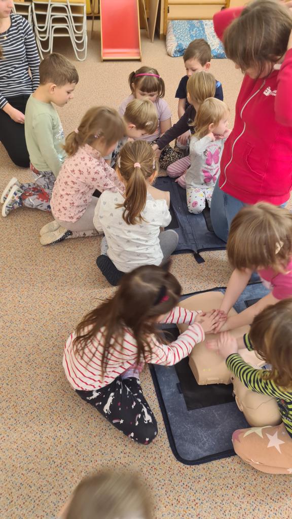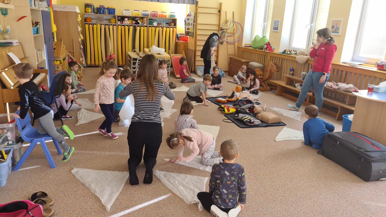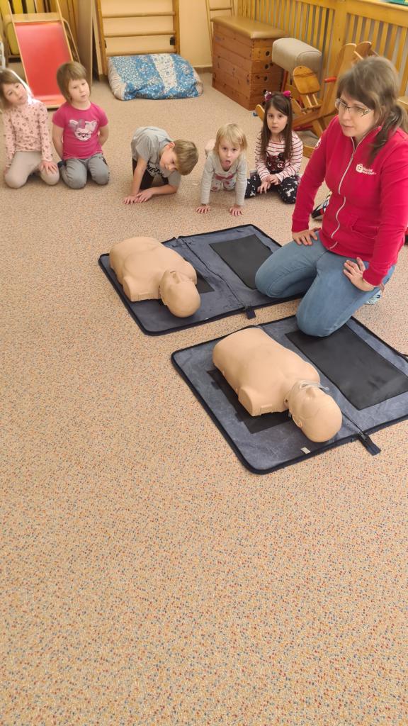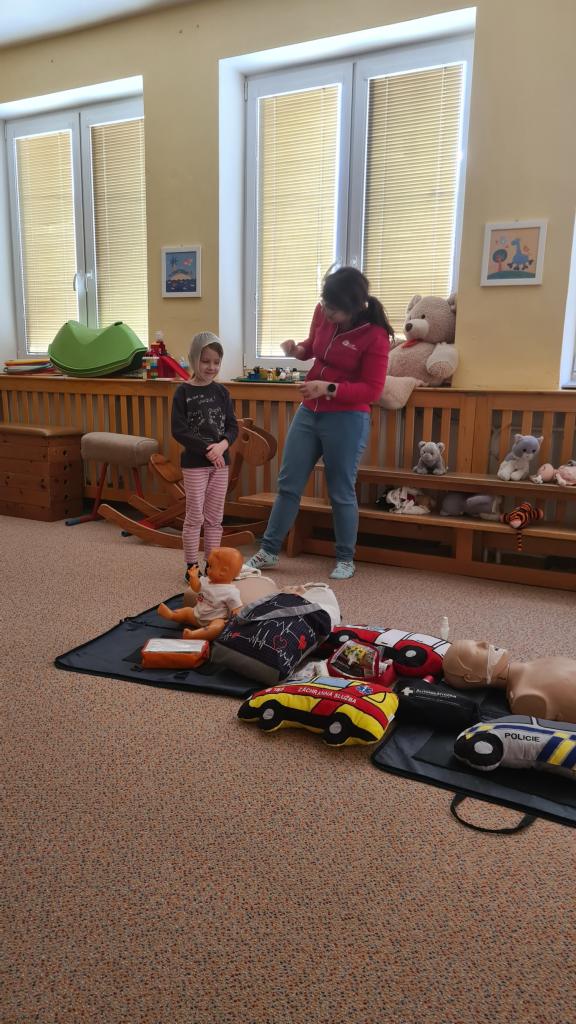 Na začátku ledna nás navštívila paní záchranářka ze zdravotní záchranné služby a připravila si pro nás aktivity týkající se první pomoci. Děti si vyzkoušely ošetřit popáleniny, masáž srdíčka, manipulovat s obvazem, vytvořit mašličku a rozeznat čísla záchranných složek.