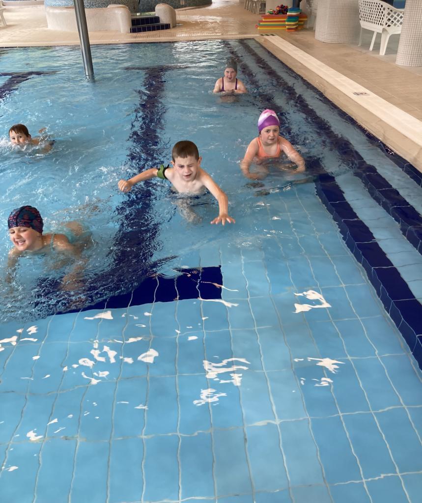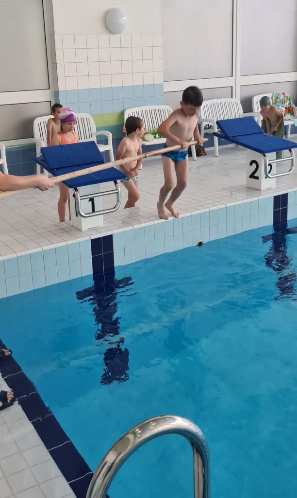 Na dalších lekcích plavání naši předškoláci pokračují ve splývání a to s pomůckami i bez. Jelikož vše zvládají výborně, přemísťují se i do větší hloubky. Zde si děti zkouší samostatně skákat do vody, níže se potopit, a také se snaží přeplavat určitý úsek. Pomalu se z dětí stávají velcí plaváčci.