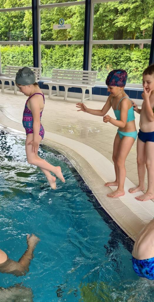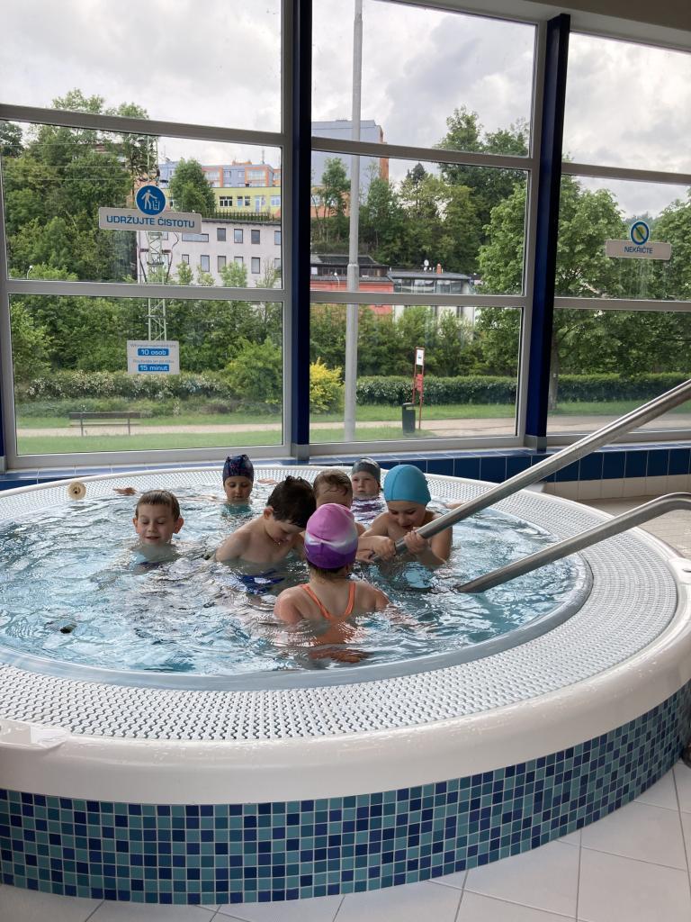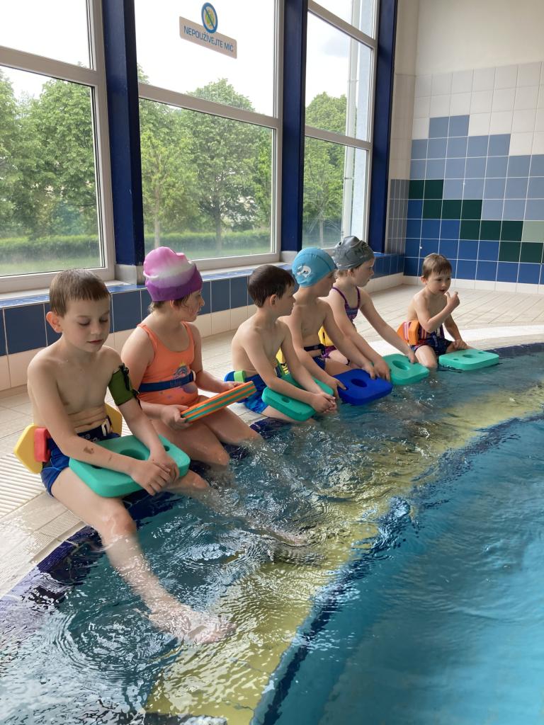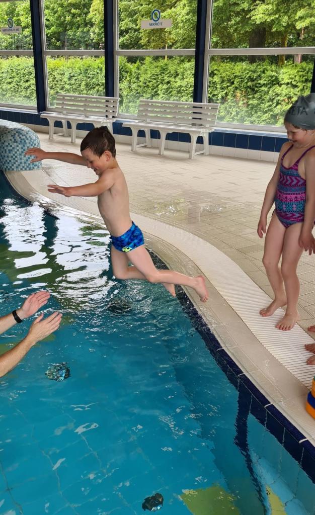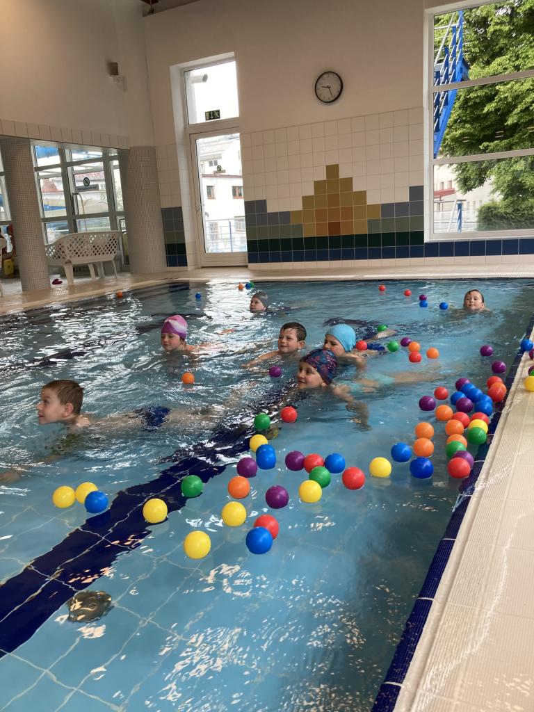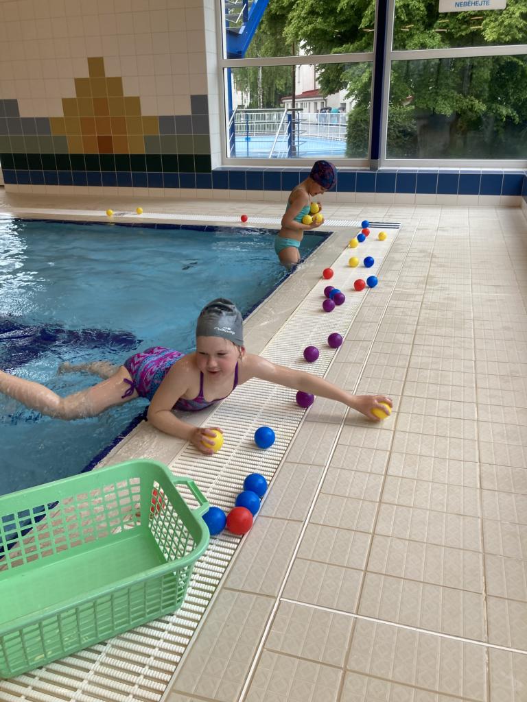 Ihned na začátku plavání se děti seznámily s pravidly hygieny a bezpečností kolem bazénů a v šatně. Zahájení plavání se velmi zdařilo, nikdo se nezalekl vody, a tak se všechny děti zapojily do pestrých aktivit: lovení míčků, schovávání se pod domečkem, hledání zvířátek, bublání do vody a splývání.
