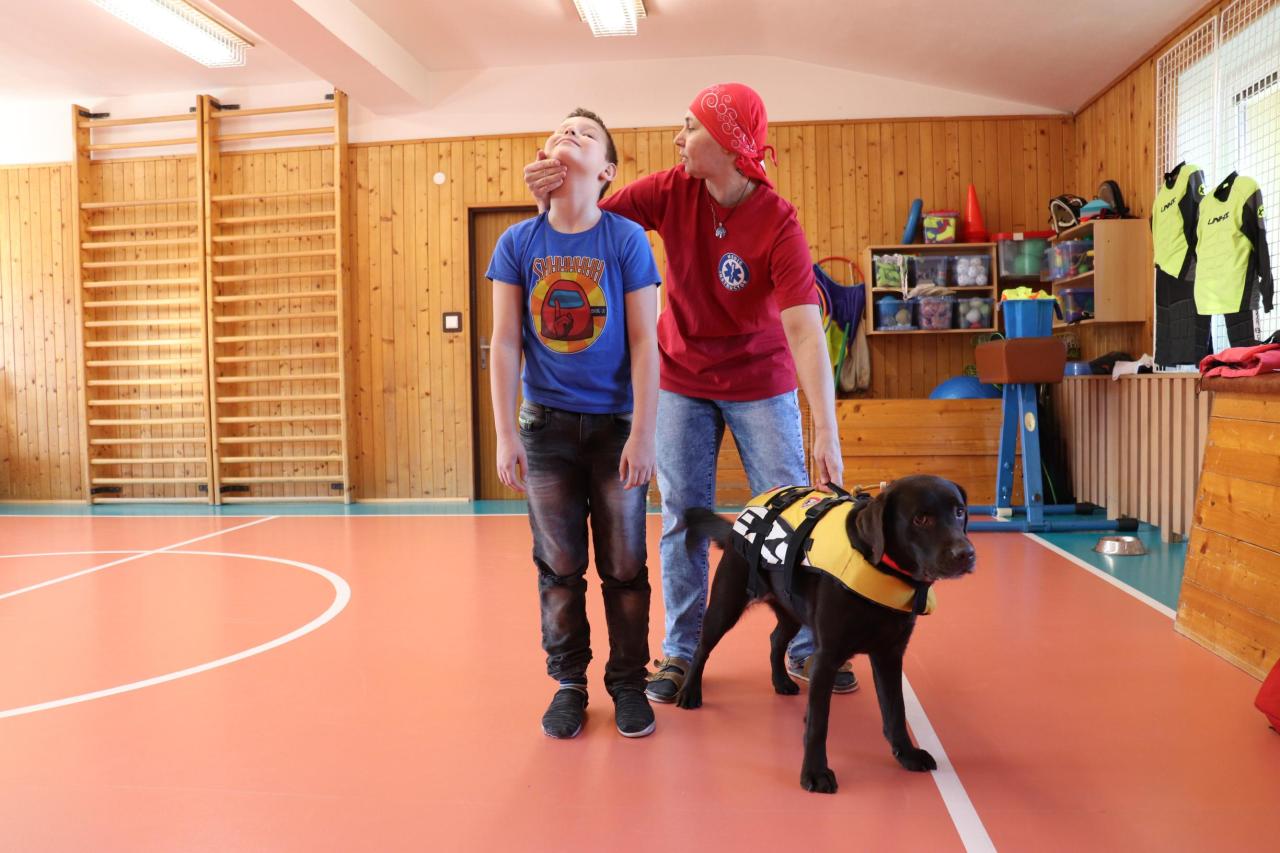 Tessie je také terapeutický pes a tak nechyběly ani ukázky canisterapie, například slupnutí piškotu z dětských zad. Nejvíce se samozřejmě dětem líbilo, když si mohly Tessie pohladit.