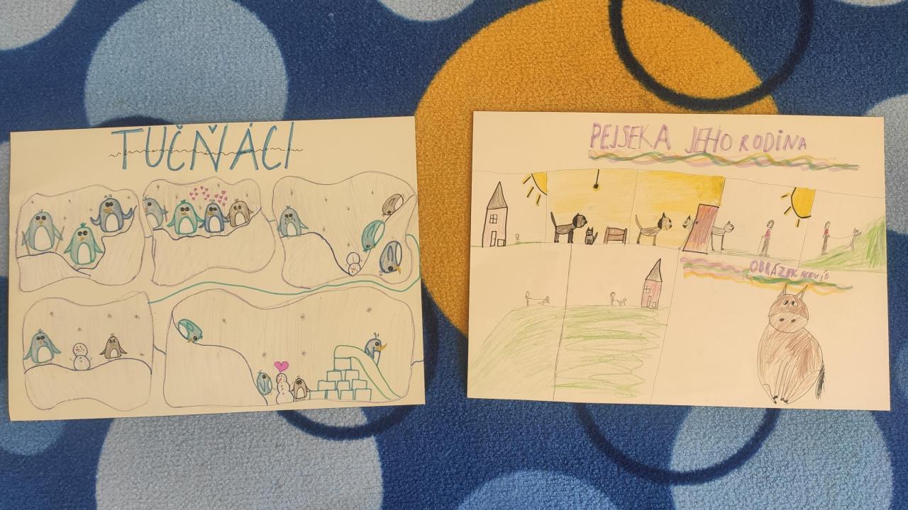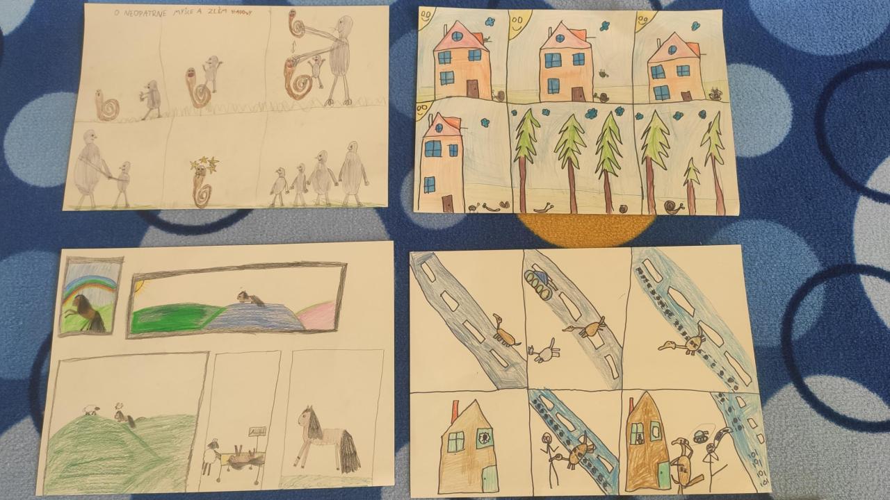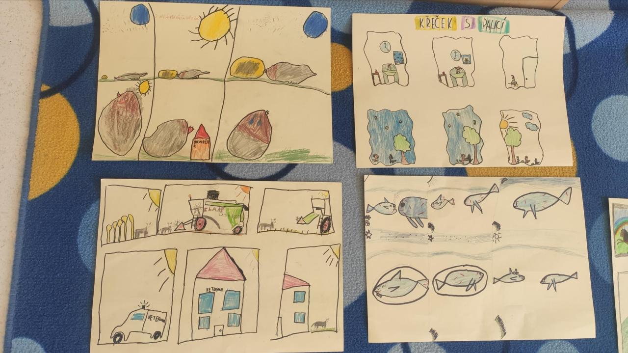 V následující hodině výtvarné výchovy jsme pak na získané poznatky z exkurze navázali a pokusili jsme se s dětmi vytvořit vlastní ilustrovaný příběh bez mluveného slova, podobně jako autor a ilustrátor Pavel Čech. Je zřejmé, že budoucích ilustrátorů máme ve třídě víc než dost. Posuďte sami!